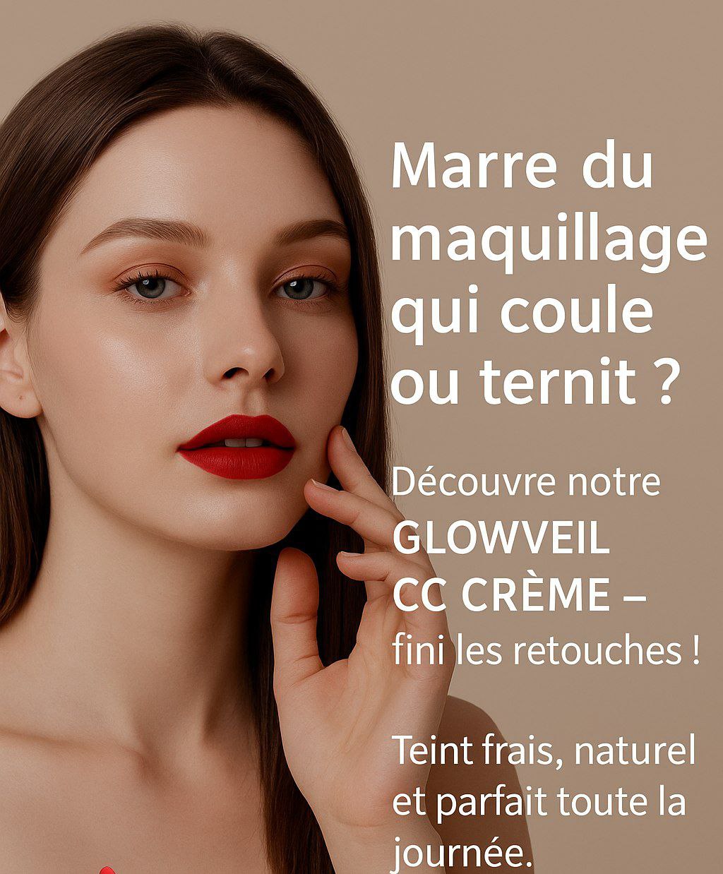 Le Secret d’un Teint Zéro Défaut Photo à insérer :Portrait lifestyle d’une femme et d’un homme à la peau parfaite, souriants à la lumière naturelle, symbolisant l’universalité du produit.Légère, performante et agréable à porter, la Glowveil CC Crème est devenue un essentiel beauté. Que vous préfériez un effet nude ou un look sophistiqué, elle s’adapte à vos besoins. Adoptez Glowveil et révélez le teint parfait dont vous avez toujours rêvé — frais, uniforme et lumineux, sans effort